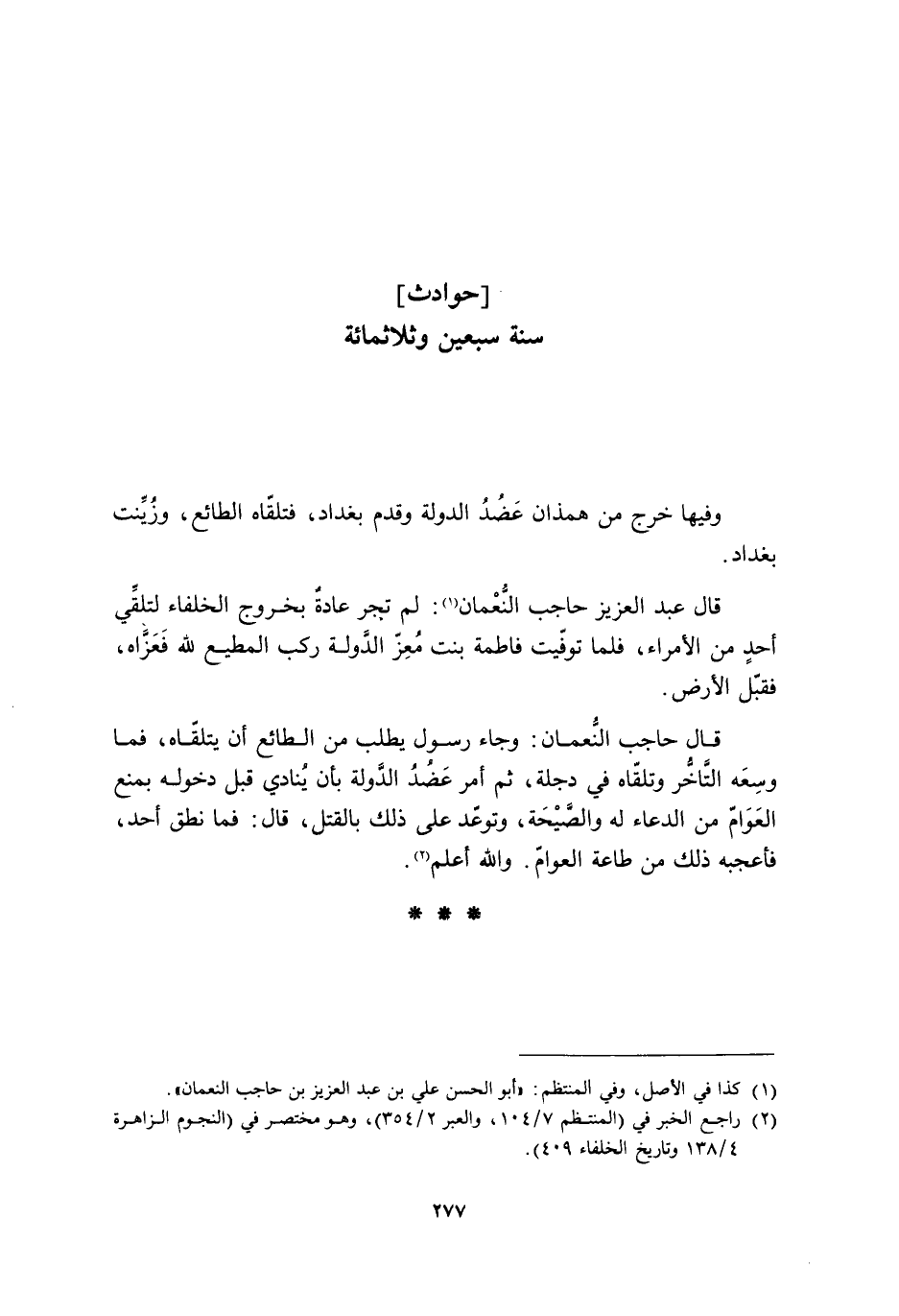 [2] راجع الخبر في (المنتظم 7/ 104، والعبر 2/ 354) ، وهو مختصر في (النجوم الزاهرة 4/ 138 وتاريخ الخلفاء 409) .