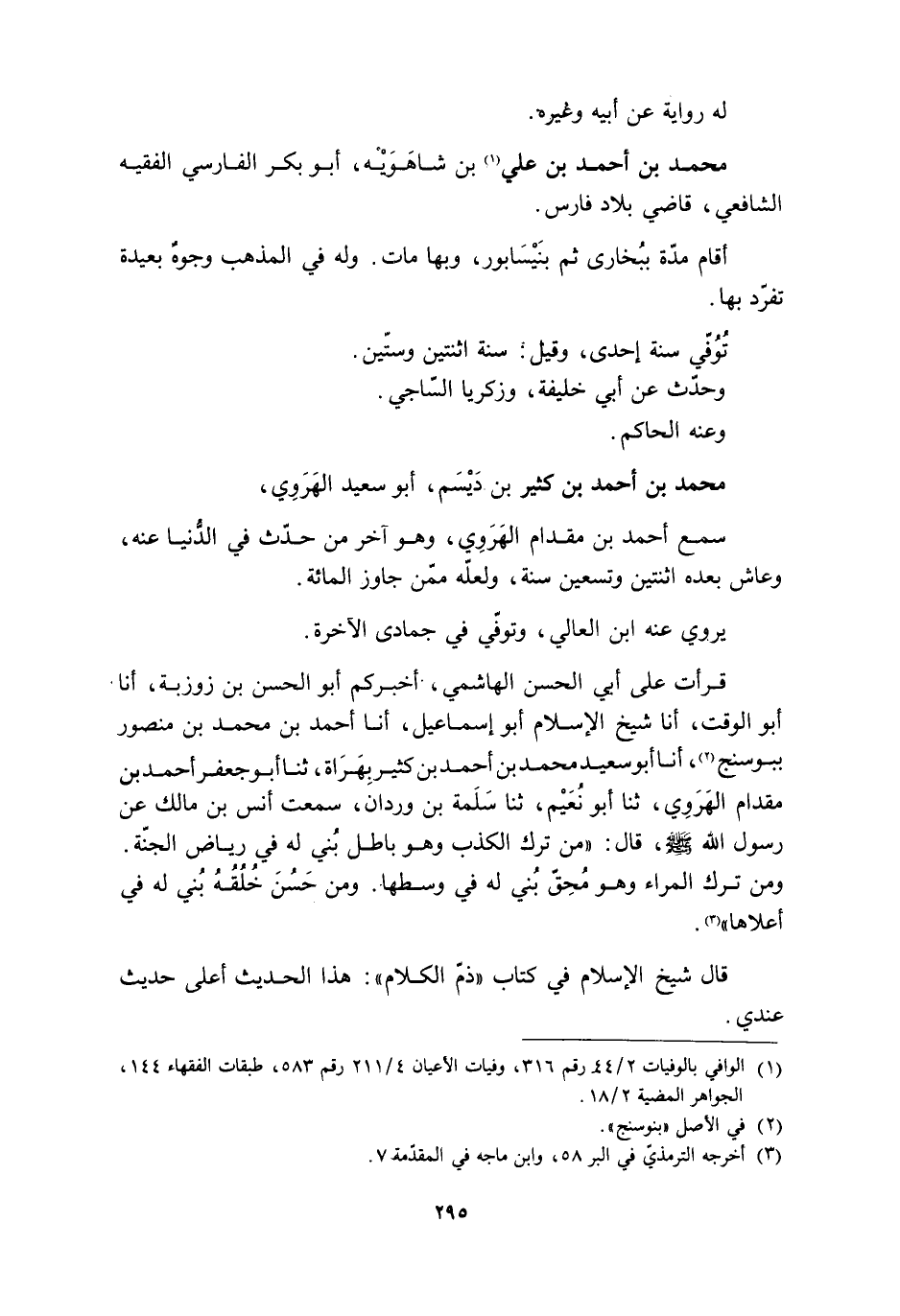 وَمَنْ تَرَكَ الْمِرَاءَ وَهُوَ مُحِقٌّ بُنِيَ لَهُ فِي وَسَطِهَا. وَمَنْ حَسُنَ خُلُقُهُ بُنِيَ لَهُ فِي أَعْلاهَا» [3] . قال شيخ الإسلام في كتاب «ذمّ الكلام» : هذا الحديث أعلى حديث عندي.
