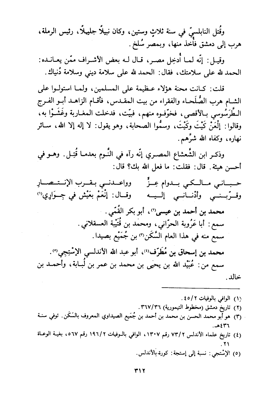وقُتل النابلسيّ في سنة ثلاثٍ وستين، وكان نبيلًا جليلًا، رئيس الرملة، هرب إلى دمشق فأخذ منها، وبمصر سُلخ.