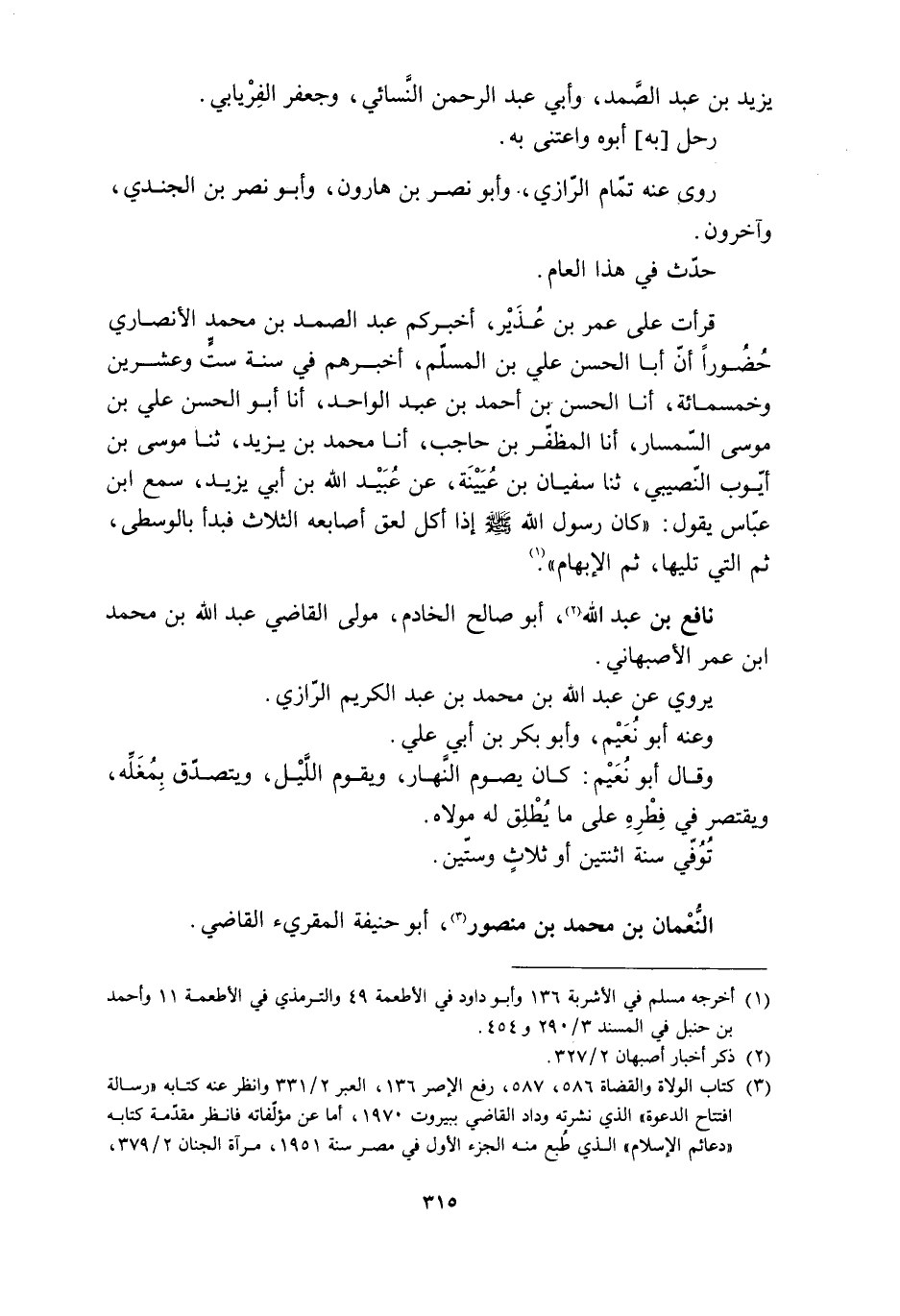 قَرَأْتُ عَلَى عُمَرَ بْنِ عُذَيْرٍ، أَخْبَرَكُمْ عَبْدُ الصَّمَدِ بْنُ محمد الأَنْصَارِيُّ حُضُورًا أَنَّ أَبَا الْحَسَنِ عَلِيَّ بْنَ الْمُسْلِمِ، أَخْبَرَهُمْ فِي سنة سِتٍّ وَعِشْرِينَ وَخَمْسِمِائَةٍ، أَنَا الْحَسَنُ بْنُ أَحْمَدَ بْنِ عَبْدِ الْوَاحِدِ، أنا أَبُو الْحَسَنِ عَلِيُّ بْنُ مُوسَى السِّمْسَارُ، أنا الْمُظَفَّرُ بْنُ حَاجِبٍ، أنا محمد بْنُ يَزِيدَ، ثنا مُوسَى بْنُ أَيُّوبَ النُّصَيْبِيُّ، ثنا سُفْيَانُ بْنُ عُيَيْنَةَ، عَنْ عُبَيْدِ اللَّهِ بْنِ أَبِي يَزِيدَ، سَمِعَ ابْنَ عَبَّاسٍ يَقُولُ: «كَانَ رَسُولُ اللَّهِ صَلَّى اللَّهُ عَلَيْهِ وَسَلَّمَ إِذَا أَكَلَ لَعِقَ أَصَابِعَهُ الثَّلاثَ فَبَدَأَ بِالْوُسْطَى، ثُمَّ الَّتِي تَلِيهَا، ثُمَّ الإِبْهَامِ» [1] . نافع بن عبد الله [2] ، أبو صالح الخادم، مولى القاضي عبد الله بن محمد ابن عمر الأصبهاني.