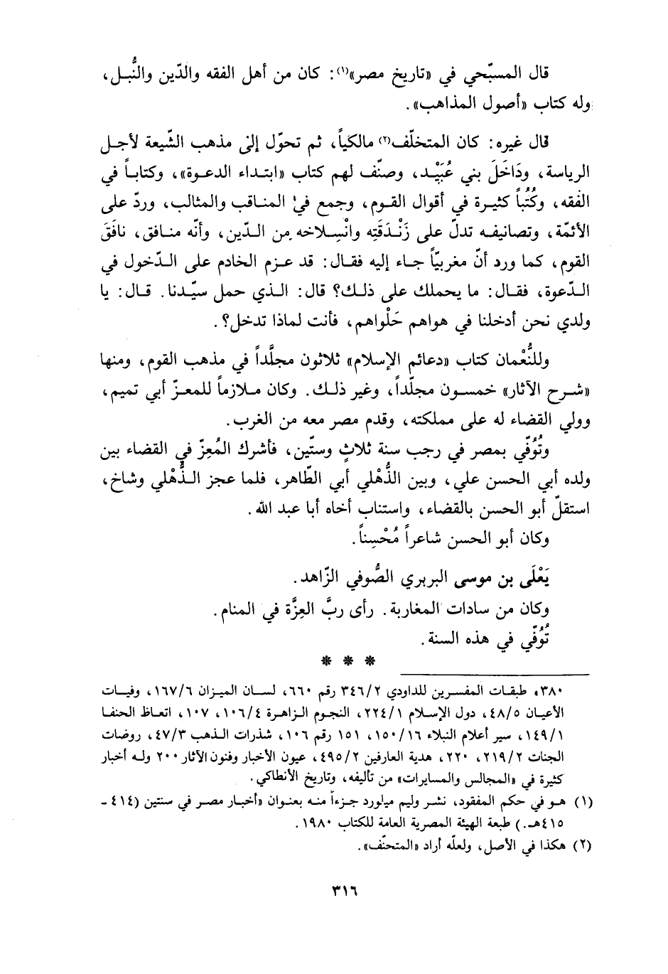قال غيره: كان المتخلّف [2] مالكيا، ثم تحوّل إلى مذهب الشّيعة لأجل الرئاسة، ودَاخَل بني عُبَيْد، وصنّف لهم كتاب «ابتداء الدعوة» ، وكتابًا في الفقه، وكُتُبًا كثيرة في أقوال القوم، وجمع في المناقب والمثالب، وردّ على الأئمة، وتصانيفة تدلّ على زَنْدَقَتِه وانْسِلاخه مِن الدّين، وأنّه منافق، نافَقَ القوم، كما ورد أنّ مغربيًّا جاء إليه فقال: قد عزم الخادم على الدّخول في الدّعوة، فقال: ما يحملك على ذلك؟ قال: الذي حمل سيّدنا. قال: يا ولدي نحن أدخلنا في هواهم حَلْواهم، فأنت لماذا تدخل؟.