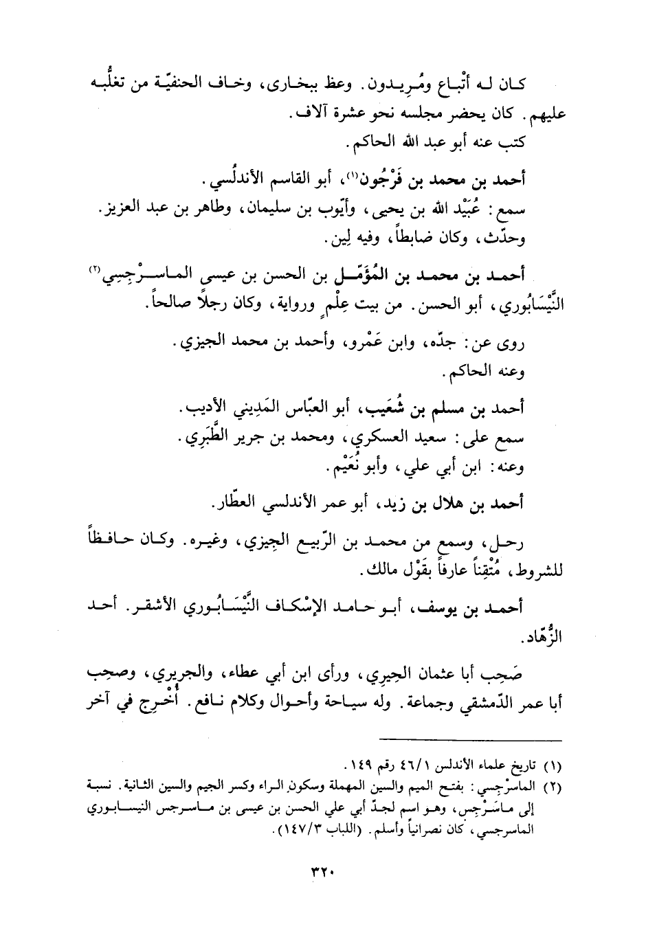 أحمد بن محمد بن المؤمل بن الحسن بن عيسى الماسرْجِسِيّ [2] النَّيْسَابُوري، أبو الحسن. من بيت عِلْمٍ ورواية، وكان رجلًا صالحًا.