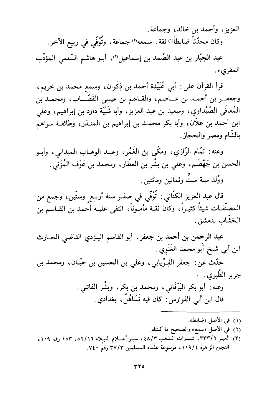 [3] العبر 2/ 333، شذرات الذهب 3/ 48، سير أعلام النبلاء 16/ 52، 153 رقم 109، النجوم الزاهرة 4/ 109، موسوعة علماء المسلمين 3/ 37 رقم 740.