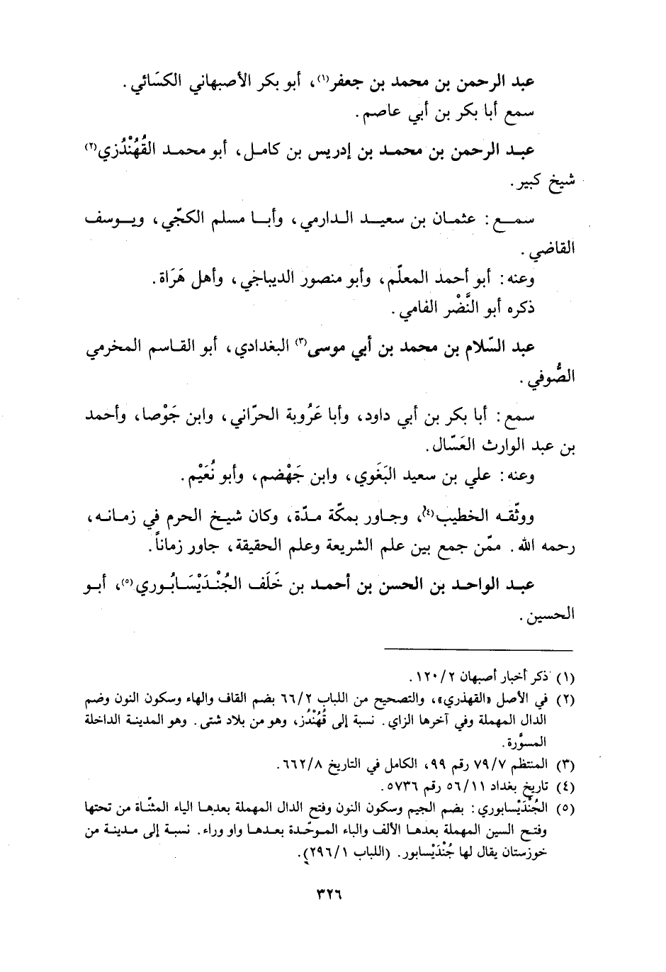 [5] الجنديسابوري: بضم الجيم وسكون النون وفتح الدال المهملة بعدها الياء المثنّاة من تحتها وفتح السين المهملة بعدها الألف والباء الموحّدة بعدها واو وراء. نسبة إلى مدينة من خوزستان يقال لها جنديسابور. (اللباب 1/ 296) .