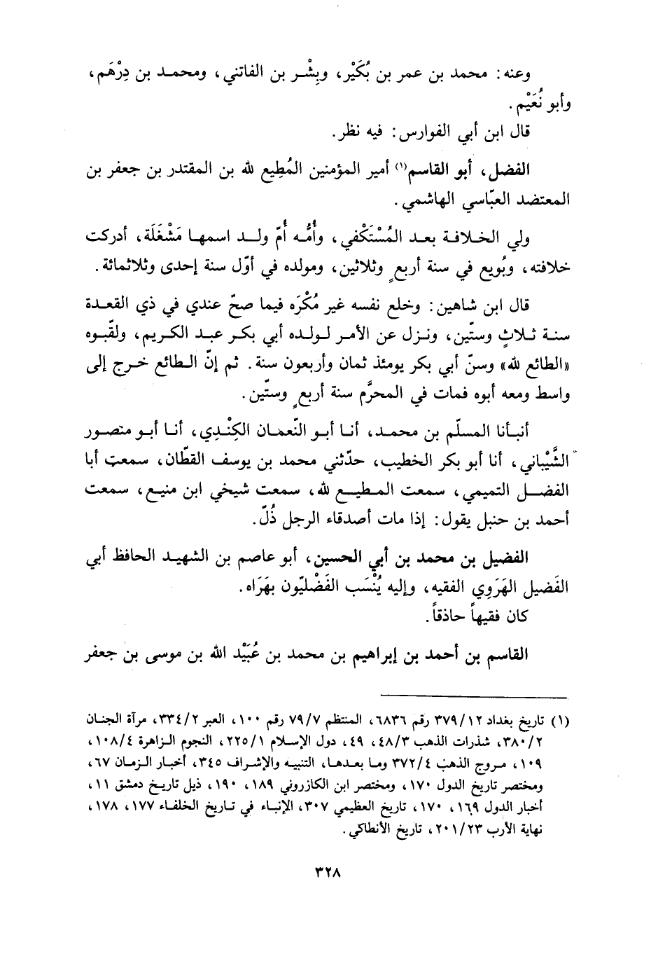 [1] تاريخ بغداد 12/ 379 رقم 6836، المنتظم 7/ 79 رقم 100، العبر 2/ 334، مرآة الجنان 2/ 380، شذرات الذهب 3/ 48، 49، دول الإسلام 1/ 225، النجوم الزاهرة 4/ 108، 109، مروج الذهب 4/ 372 وما بعدها، التنبيه والإشراف 345، أخبار الزمان 67، ومختصر تاريخ الدول 170، ومختصر ابن الكازروني 189، 190، ذيل تاريخ دمشق 11، أخبار الدول 169، 170، تاريخ العظيمي 307، الإنباء في تاريخ الخلفاء 177، 178، نهاية الأرب 23/ 201، تاريخ الأنطاكي.