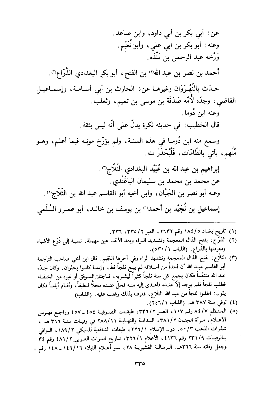 [3] الثلّاج: بفتح الذال المعجمة وتشديد الراء وفي آخرها الجيم. قال ابن أخي صاحب الترجمة أبو القاسم عبد الله أن أحدا من أسلافه لم يبع ثلجا قطّ، وإنما كانوا بحلوان. وكان جدّه عبد الله متنعّما فكان يجمع كل سنة ثلجا كثيرا ليشربه، فاجتاز الموفق أو غيره من الخلفاء فطلب ثلجا فلم يوجد إلّا عنده فأهدى إليه منه فحلّ عنده محلّا لطيفا، وأقام أياما فكان يقول: اطلبوا ثلجا من عبد الله الثلاج، فعرف بذلك وغلب عليه. (اللباب) .