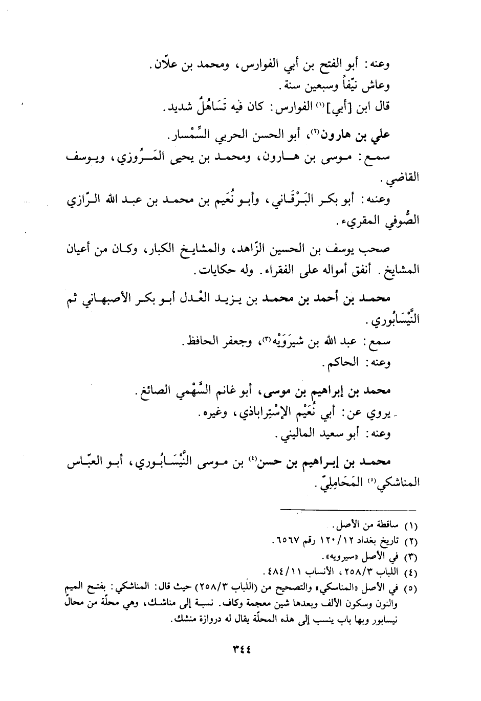 [5] في الأصل «المناسكي» والتصحيح من (اللباب 3/ 258) حيث قال: المناشكي: بفتح الميم والنون وسكون الألف وبعدها شين معجمة وكاف. نسبة إلى مناشك، وهي محلّة من محالّ نيسابور وبها باب ينسب إلى هذه المحلّة يقال له دروازه منشك.