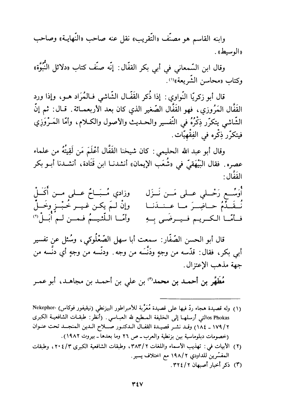 [2] الأبيات في: تهذيب الأسماء واللغات 2/ 383، وطبقات الشافعية الكبرى 3/ 204، وطبقات المفسّرين للداوديّ 2/ 198 مع اختلاف يسير.
