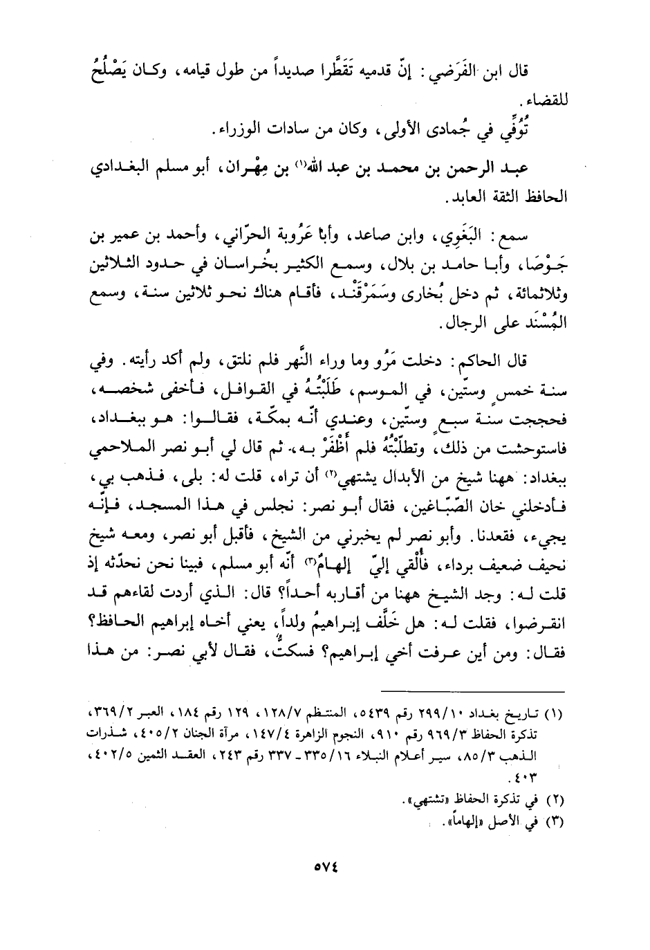 [1] تاريخ بغداد 10/ 299 رقم 5439، المنتظم 7/ 128، 129 رقم 184، العبر 2/ 369، تذكرة الحفاظ 3/ 969 رقم 910، النجوم الزاهرة 4/ 147، مرآة الجنان 2/ 405، شذرات الذهب 3/ 85، سير أعلام النبلاء 16/ 335- 337 رقم 243، العقد الثمين 5/ 402، 403.