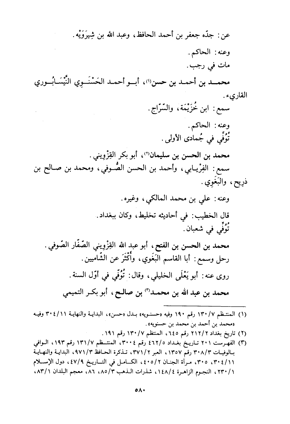 [1] المنتظم 7/ 130 رقم 190 وفيه «حسنويه» بدل «حسن» ، البداية والنهاية 11/ 304 وفيه «محمد بن أحمد بن محمد بن حسنويه» .