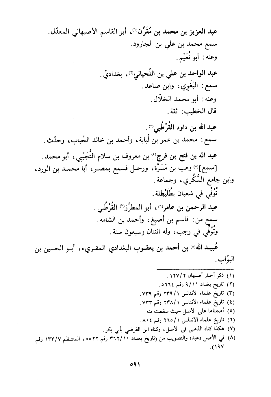 [8] في الأصل «عبد» والتصويب من (تاريخ بغداد 10/ 362 رقم 5522، المنتظم 7/ 133 رقم 197) .