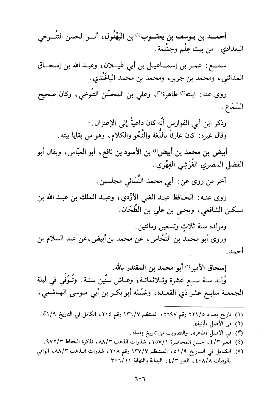 [5] الكامل في التاريخ 9/ 51، المنتظم 7/ 137 رقم 208، شذرات الذهب 3/ 88، الوافي بالوفيات 8/ 408، العبر 3/ 4، البداية والنهاية 11/ 306.