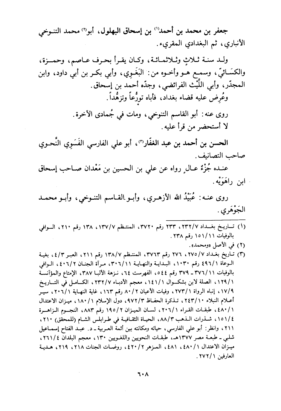 جعفر بن محمد بن أحمد [1] بن إسحاق البهلول، أبو [2] محمد التَّنُوخيّ الأنباري، ثم البغدادي المقرئ.
