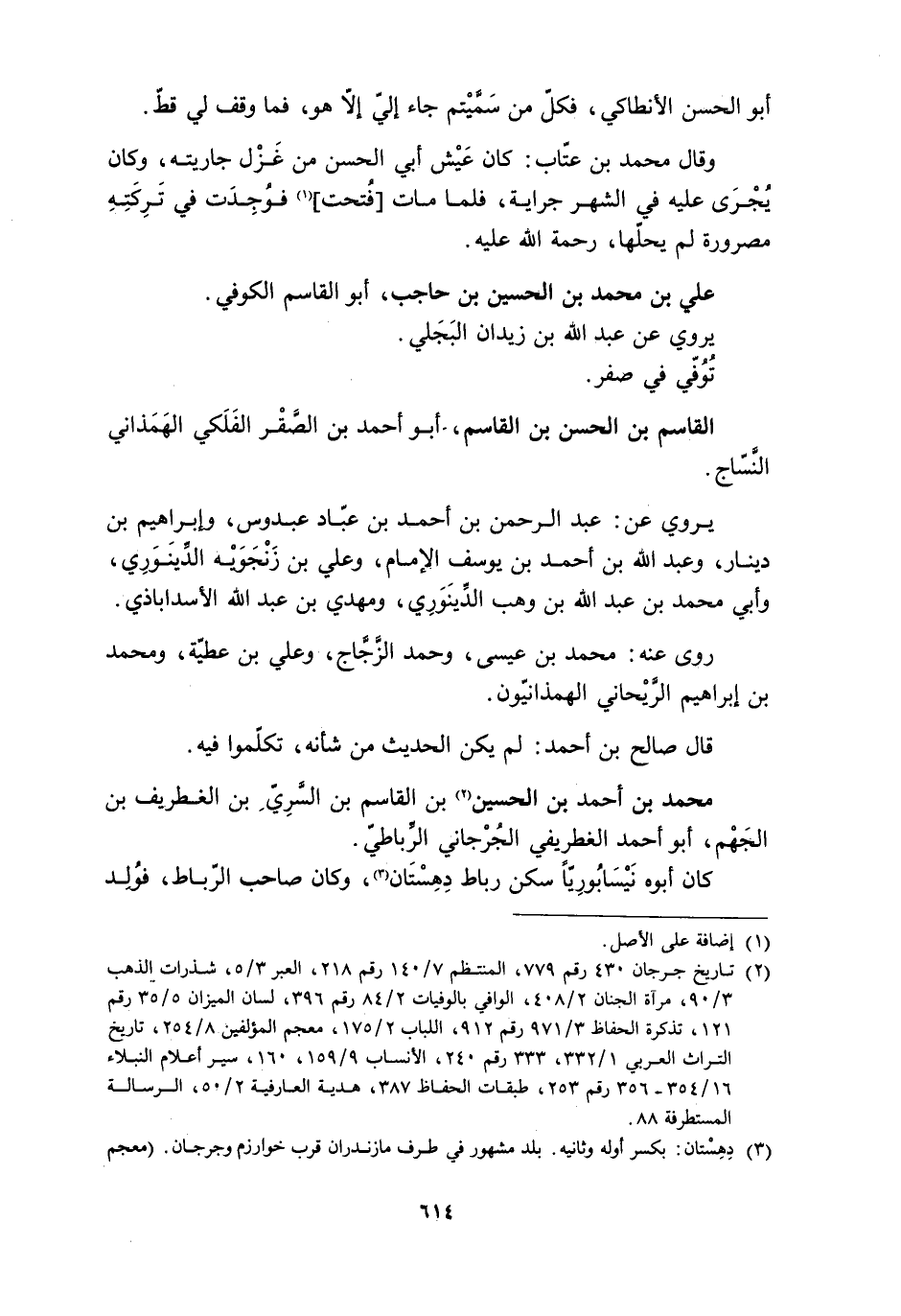 [2] تاريخ جرجان 430 رقم 779، المنتظم 7/ 140 رقم 218، العبر 3/ 5، شذرات الذهب 3/ 90، مرآة الجنان 2/ 408، الوافي بالوفيات 2/ 84 رقم 396، لسان الميزان 5/ 35 رقم 121، تذكرة الحفاظ 3/ 971 رقم 912، اللباب 2/ 175، معجم المؤلفين 8/ 254، تاريخ التراث العربيّ 1/ 332، 333 رقم 240، الأنساب 9/ 159، 160، سير أعلام النبلاء 16/ 354- 356 رقم 253، طبقات الحفاظ 387، هدية العارفية 2/ 50، الرسالة المستطرفة 88.