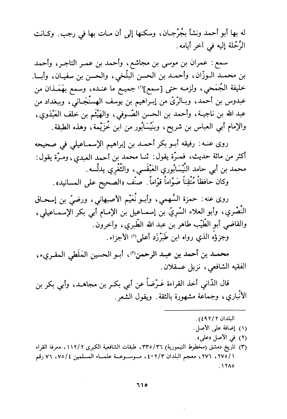 [3] تاريخ دمشق (مخطوط التيمورية) 36/ 335، طبقات الشافعية الكبرى 2/ 112، معرفة القراء 1/ 275، 276، معجم البلدان 3/ 402، موسوعة علماء المسلمين 4/ 75، 76 رقم 1285.