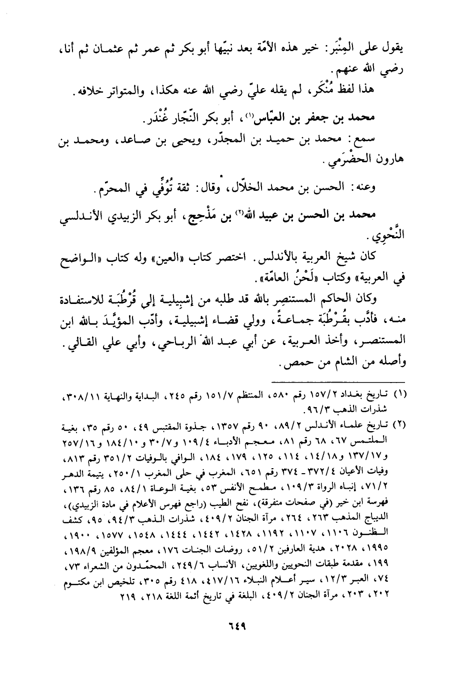 [2] تاريخ علماء الأندلس 2/ 89، 90 رقم 1357، جذوة المقتبس 49، 50 رقم 35، بغية الملتمس 67، 68 رقم 81، معجم الأدباء 4/ 109 و 7/ 30 و 10/ 184 و 16/ 257 و 17/ 137 و 18/ 14، 114، 125، 179، 184، الوافي بالوفيات 2/ 351 رقم 813، وفيات الأعيان 4/ 372- 374 رقم 651، المغرب في حلى المغرب 1/ 250، يتيمة الدهر 2/ 71، إنباه الرواة 3/ 109، مطمح الأنفس 53، بغية الوعاة 1/ 84، 85 رقم 136، فهرسة ابن خير (في صفحات متفرقة) ، نفح الطيب (راجع فهرس الأعلام في مادة الزبيدي) ، الديباج المذهب 263، 264، مرآة الجنان 2/ 409، شذرات الذهب 3/ 94، 95، كشف الظنون 1106، 1107، 1192، 1428، 1442، 1444، 1548، 1577، 1900، 1995، 2028، هدية العارفين 2/ 51، روضات الجنات 176، معجم المؤلفين 9/ 198، 199، مقدمة طبقات النحويين واللغويين، الأنساب 6/ 249، المحمّدون من الشعراء 73، 74، العبر 3/ 12، سير أعلام النبلاء 16/ 417، 418 رقم 305، تلخيص ابن مكتوم 202، 203، مرآة الجنان 2/ 409، البلغة في تاريخ أئمة اللغة 218، 219