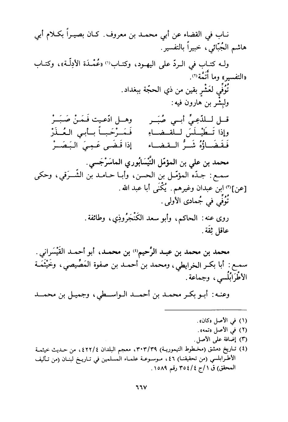 [4] تاريخ دمشق (مخطوط التيمورية) 39/ 303، معجم البلدان 4/ 422، من حديث خيثمة الأطرابلسي (من تحقيقنا) 46، موسوعة علماء المسلمين في تاريخ لبنان (من تأليف المحقق) ق 1/ ج 4/ 354 رقم 1589.