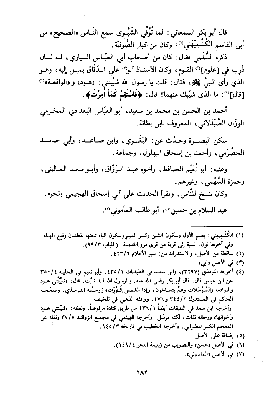 ذكره السُّلمي فقال: كان من أصحاب أبي العبّاس السياري، له لسان ذَرِب في [علوم] [2] القوم، وكان الأستاذ أبو [3] علي الدّقّاق يميل إليه، وهو الذي رأى النبي صلى الله عليه وسلم، فقال: قلت يا رسول الله شيّبتني: «هود» و «الواقعة» [4] [قال] [5] : ما الّذي شيّبك منهما؟ قال: فَاسْتَقِمْ كَما أُمِرْتَ 11: 112. أحمد بن الحسن بن محمد بن سعيد، أبو العبّاس البغدادي المخرمي.