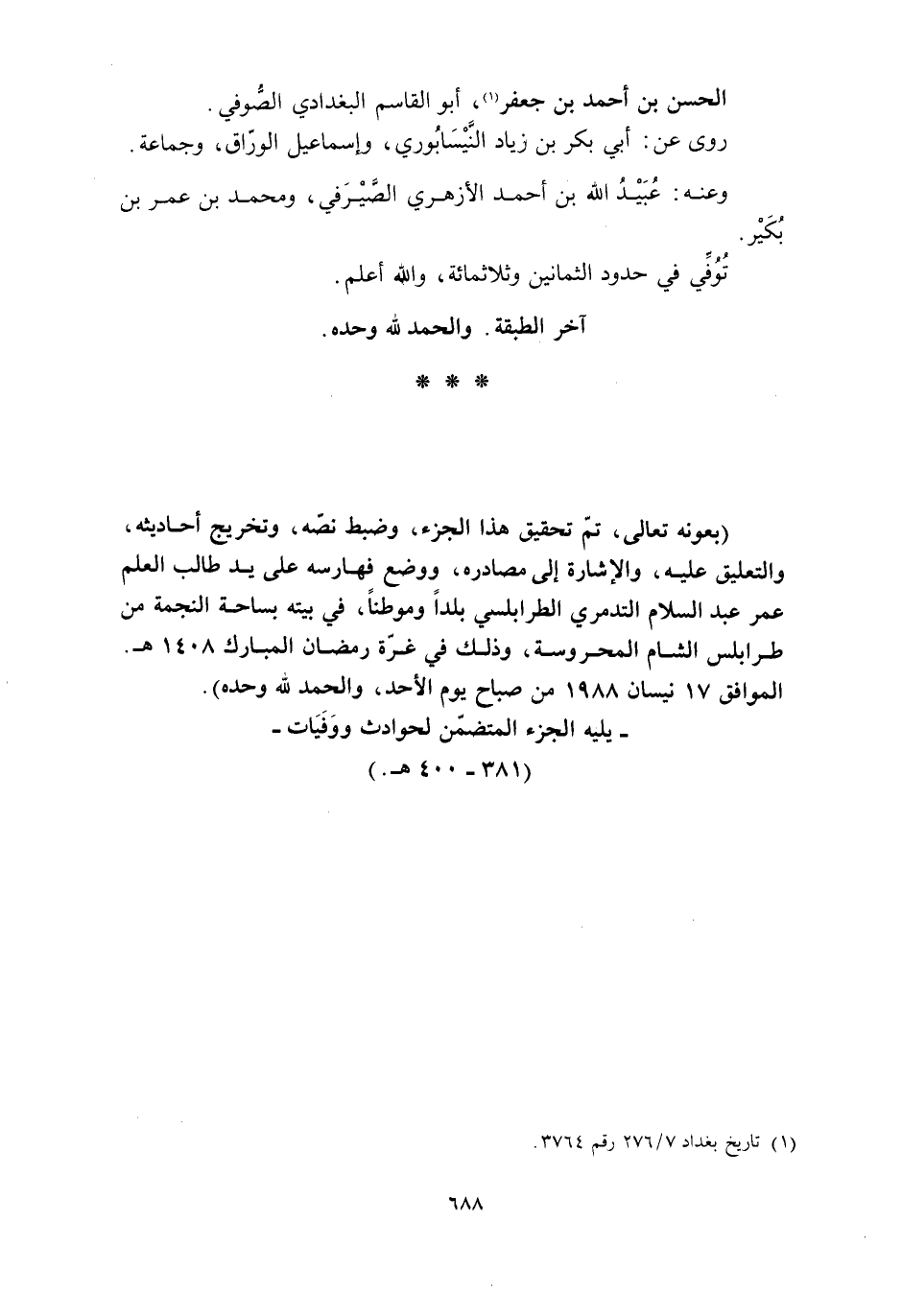 (بعونه تعالى، تمّ تحقيق هذا الجزء، وضبط نصّه، وتخريج أحاديثه، والتعليق عليه، والإشارة إلى مصادره، ووضع فهارسه على يد طالب العلم عمر عبد السلام التدمري الطرابلسي بلدا وموطنا، في بيته بساحة النجمة من طرابلس الشام المحروسة، وذلك في غرّة رمضان المبارك 1408 هـ.