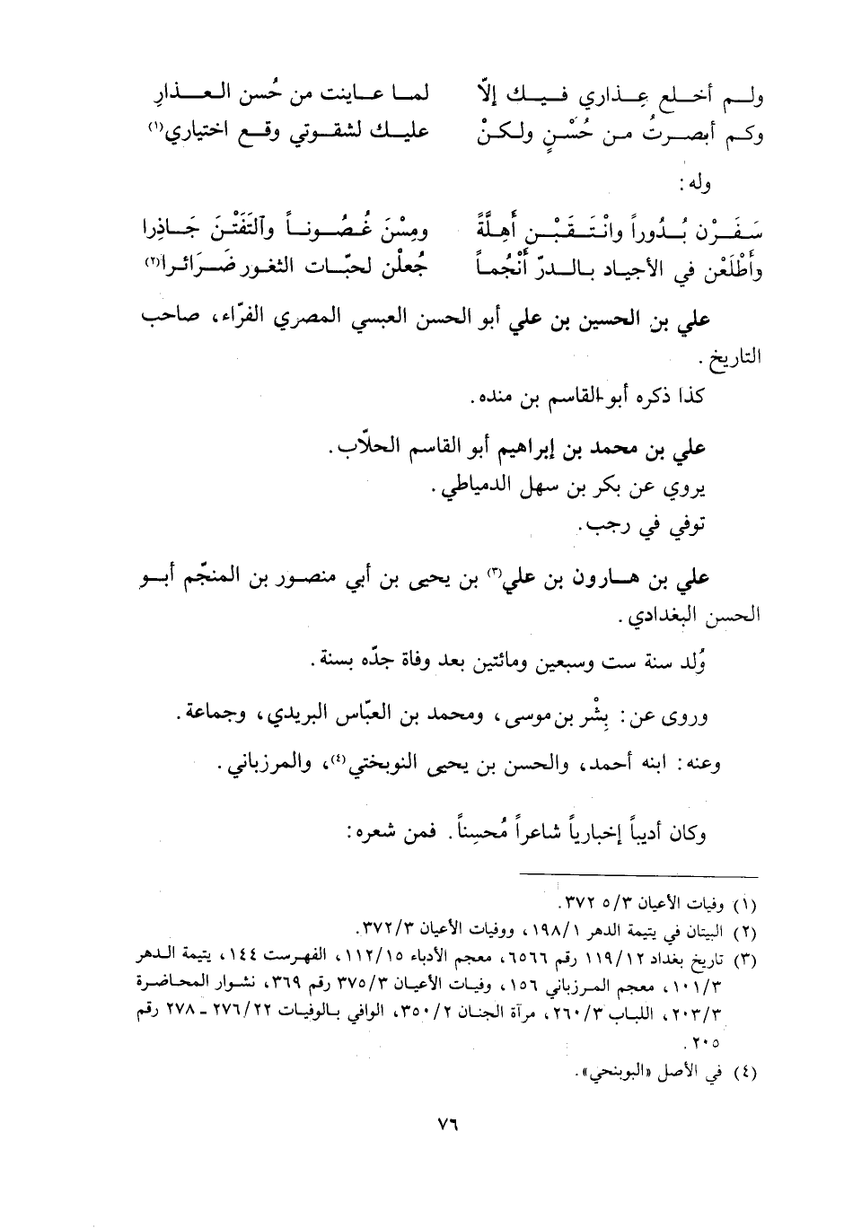 [3] تاريخ بغداد 12/ 119 رقم 6566، معجم الأدباء 15/ 112، الفهرست 144، يتيمة الدهر 3/ 101، معجم المرزباني 156، وفيات الأعيان 3/ 375 رقم 369، نشوار المحاضرة 3/ 203، اللباب 3/ 260، مرآة الجنان 2/ 350، الوافي بالوفيات 22/ 276- 278 رقم 205.