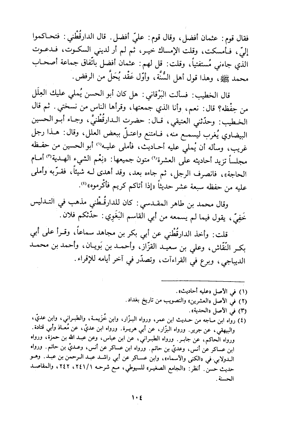 فَقَالَ قوم: عثمان افضل، وقَالَ قوم: عَلِيّ أفضل. قال الدار قطنى: فتحاكموا إليّ، فأمسكت، وقلت الْأمساك خير، ثم لم أر لديني السكوت، فدعوت الَّذِي جاءني مستفتيا، وقلت: قل لهم: عثمان أفضل باتفاق جماعة أصحاب مُحَمَّد صَلَّى اللَّه عَلَيْهِ وَسَلَّمَ، وهذا قول أهل السُّنَّة، وأول عقْد يُحِلَّ من الرفض.