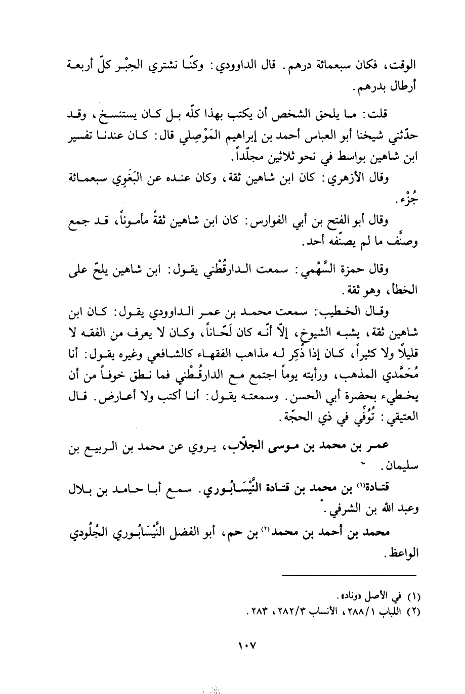 قلت: ما يلحق الشخص أن يكتب بهذا كلّه بل كَانَ يستنسخ، وقد حدّثني شيخنا أَبُو الْعَبَّاس أحْمَد بْن إِبْرَاهِيم المَوْصِلي قَالَ: كَانَ عندنا تفسير ابن شاهين بواسط فِي نحو ثلاثين مُجلّدًا.