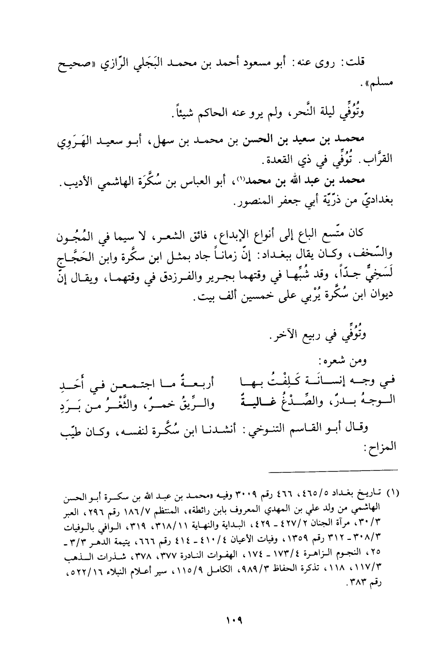[1] تاريخ بغداد 5/ 465، 466 رقم 3009 وفيه «محمد بن عبد الله بن سكرة أبو الحسن الهاشمي من ولد على بن المهدي المعروف بابن رائطة» ، المنتظم 7/ 186 رقم 296، العبر 3/ 30، مرآة الجنان 2/ 427- 429، البداية والنهاية 11/ 318، 319، الوافي بالوفيات 3/ 308- 312 رقم 1359، وفيات الأعيان 4/ 410- 414 رقم 666، يتيمة الدهر 3/ 3- 25، النجوم الزاهرة 4/ 173- 174، الهفوات النادرة 377، 378، شذرات الذهب 3/ 117، 118، تذكرة الحفاظ 3/ 989، الكامل 9/ 115، سير أعلام النبلاء 16/ 522، رقم 383.