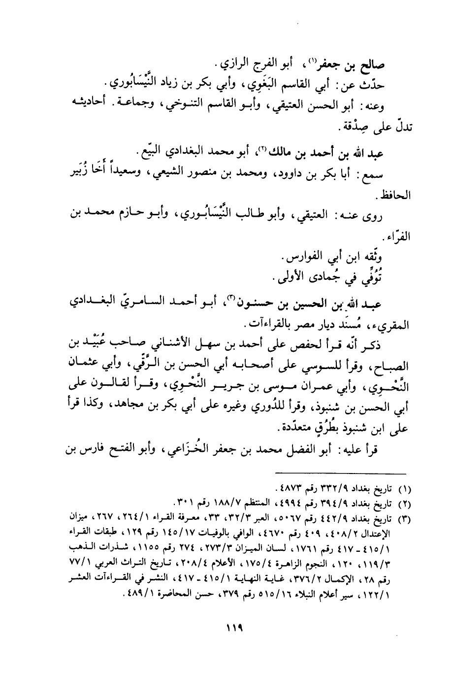 [3] تاريخ بغداد 9/ 442 رقم 5067، العبر 3/ 32، 33، معرفة القراء 1/ 264، 267، ميزان الاعتدال 2/ 408، 409، رقم 4670، الوافي بالوفيات 17/ 145 رقم 129، طبقات القراء 1/ 415- 417 رقم 1761، لسان الميزان 3/ 273، 274 رقم 1155، شذرات الذهب 3/ 119، 120، النجوم الزاهرة 4/ 175، الأعلام 4/ 208، تاريخ التراث العربيّ 1/ 77 رقم 28، الإكمال 2/ 376، غاية النهاية 1/ 415- 417، النشر في القراءات العشر 1/ 122، سير أعلام النبلاء 16/ 515 رقم 379، حسن المحاضرة 1/ 489.