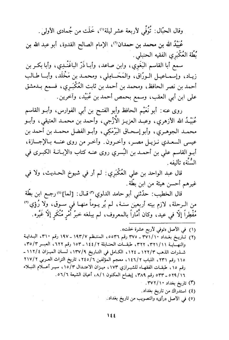 عُبَيْد اللَّه بْن مُحَمَّد بْن حمدان [2] ، الْإمَام الصالح القدوة، أَبُو عَبْد اللَّه بْن بُطّة العُكْبرِي الفقيه الحنبلي.