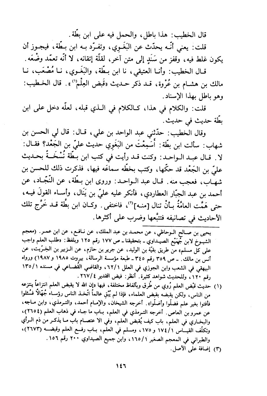 قَالَ الخطيب: وأنا العتيقي، نا ابن بطة، والبَغَوي، نا مُصْعَب، نا مالك بْن هشام بْن عُروة، قد ذكر حديث «قَبْض العِلْم [1] » . قَالَ الخطيب: