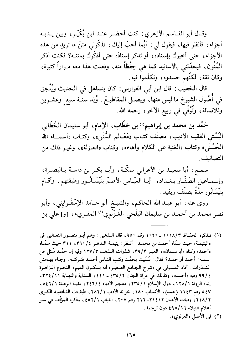 [1] تذكرة الحفاظ 3/ 1018- 1020 رقم 950، قال الذهبي: وهم أبو منصور الثعالبي في «اليتيمة» حيث سمّاه أحمد بن محمد. انظر: يتيمة الدهري 4/ 310، 311، حيث سمّاه «أحمد» وكناه «أبا سليمان» ، العبر 3/ 39، شذرات الذهب 3/ 127 وفيه إن حمد سئل عن اسمه: أحمد أو حمد؟ فقال: سمّيت بحمد وكتب الناس أحمد فتركته. وجاء بهامش الشذرات: أفاد المتبولي في «شرح الجامع الصغير» أنه بسكون الميم، النجوم الزاهرة 4/ 99 وفيه «أحمد» ، وكذلك في مرآة الجنان 2/ 435- 441، البداية والنهاية 11/ 324، إنباه الرواة 1/ 125، دول الإسلام 1/ 235، معجم الأدباء 4/ 246، بغية الوعاة 1/ 546، 547 رقم 1143 (حمد) ، الأنساب 180، خزانة الأدب 1/ 282، طبقات الشافعية الكبرى 2/ 218، وفيات الأعيان 2/ 214- 216 رقم 207، اللباب 1/ 452، وذكره المؤلّف في سير أعلام النبلاء 16/ 495 دون ترجمة.