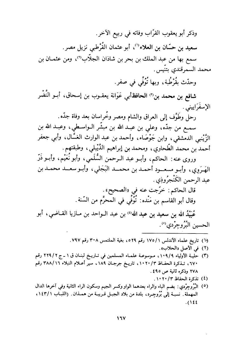 [3] حلية الأولياء 9/ 109، موسوعة علماء المسلمين في تاريخ لبنان ق 1- ج 2/ 229 رقم 670، تذكرة الحفاظ 3/ 1020، تاريخ جرجان 189، سير أعلام النبلاء 16/ 388 رقم 278 وذكره ثانية ص 495.