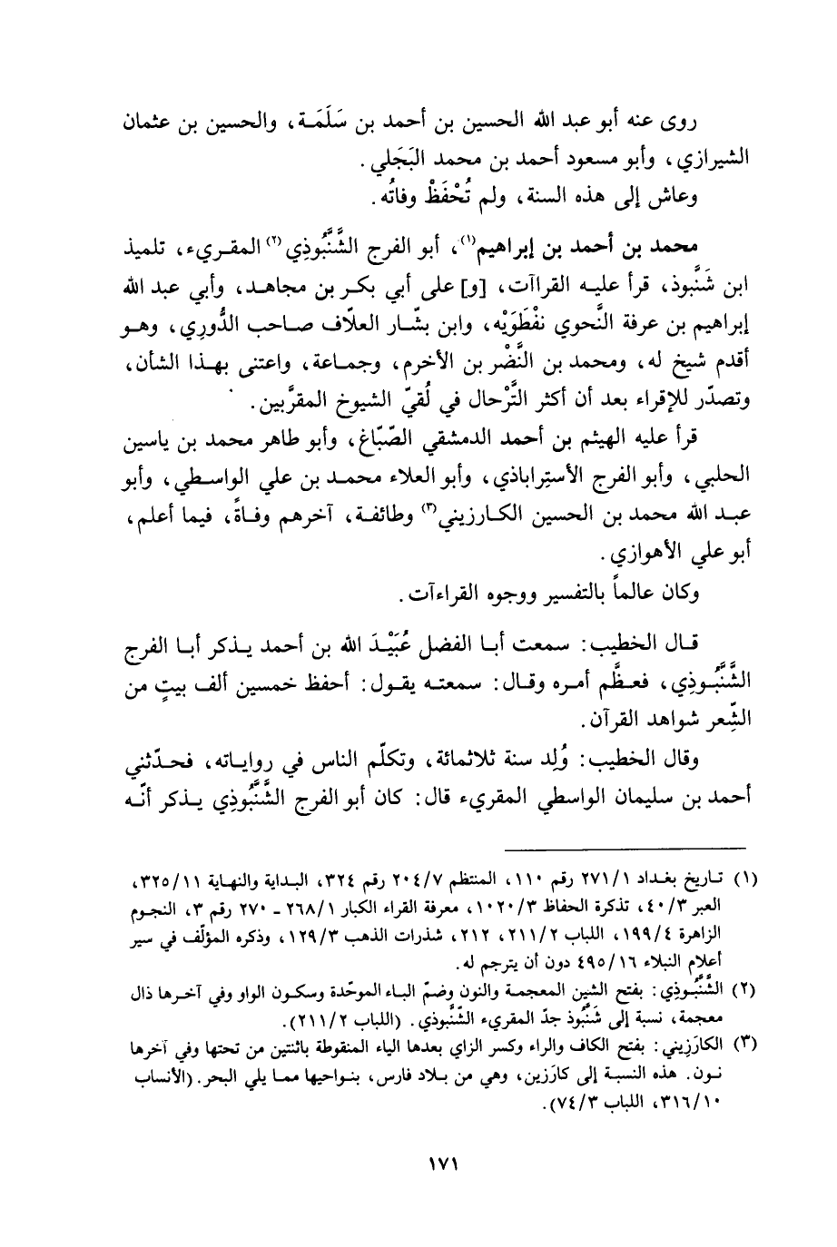 [2] الشّنّبوذى: بفتح الشين المعجمة والنون وضمّ الباء الموحّدة وسكون الواو وفي آخرها ذال معجمة، نسبة إلى شنّبوذ جدّ المقرئ الشّنّبوذى. (اللباب 2/ 211) .