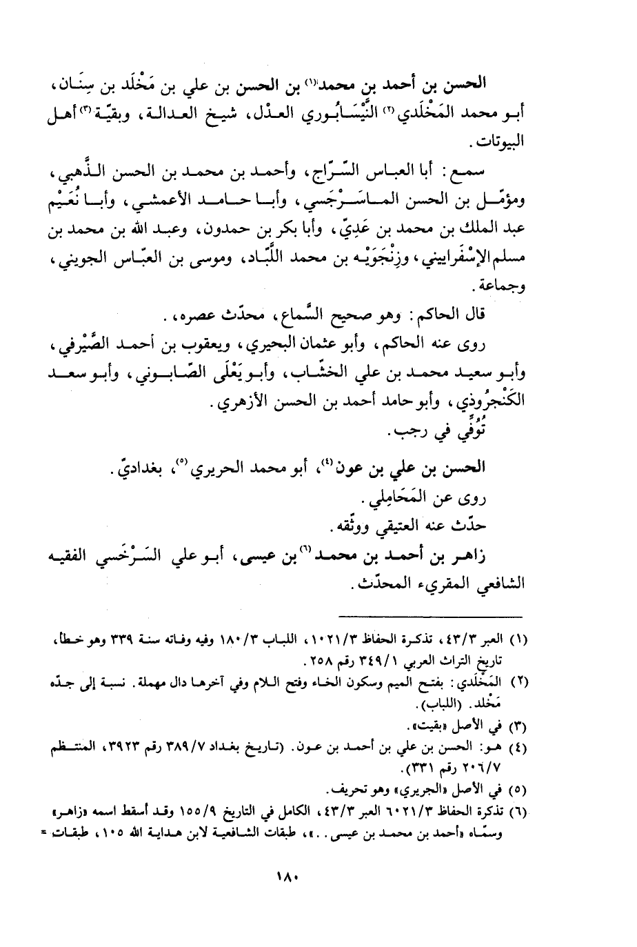 الحسن بْن أَحْمَد بْن مُحَمَّد [1] بْن الْحَسَن بْن عَلِيّ بْن مخلد بْن سنان، أَبُو مُحَمَّد المخلدي [2] النيسابُوري العدل، شيخ العدالة، وبقية [3] أهل البيوتات.