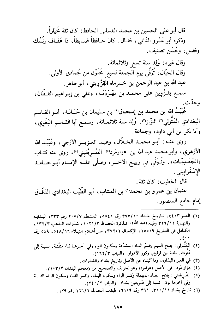 [1] العبر 3/ 44، تاريخ بغداد 10/ 377 رقم 5540، المنتظم 7/ 207 رقم 333، البداية والنهاية 11/ 326 وفيه «عبد الله» ، تذكرة الحفاظ 3/ 1021، شذرات الذهب 3/ 132، الكامل في التاريخ 9/ 155، الإكمال 2/ 372، سير أعلام النبلاء 16/ 548، 549 رقم 400.
