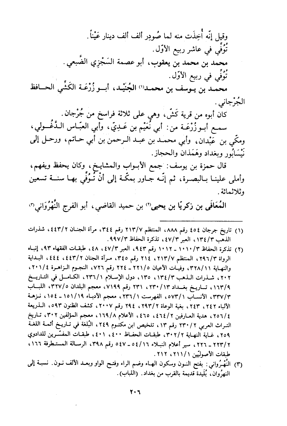 [1] تاريخ جرجان 454 رقم 888، المنتظم 7/ 213 رقم 344، مرآة الجنان 2/ 443، شذرات الذهب 3/ 134، العبر 3/ 47، تذكرة الحفاظ 3/ 997.