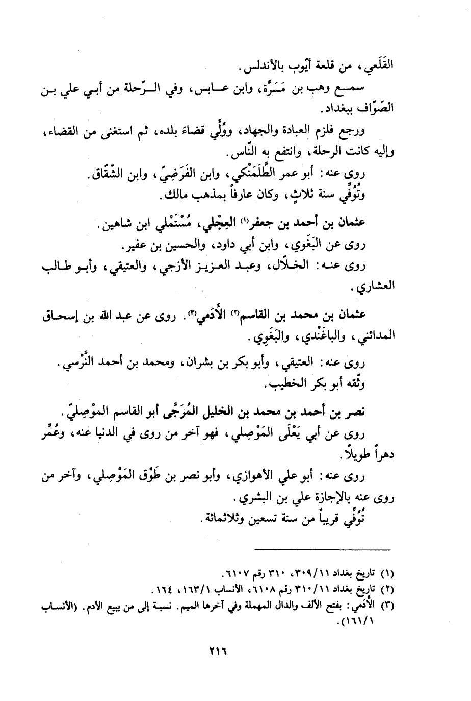 [2] تاريخ بغداد 11/ 310 رقم 6108، الأنساب 1/ 163، 164.