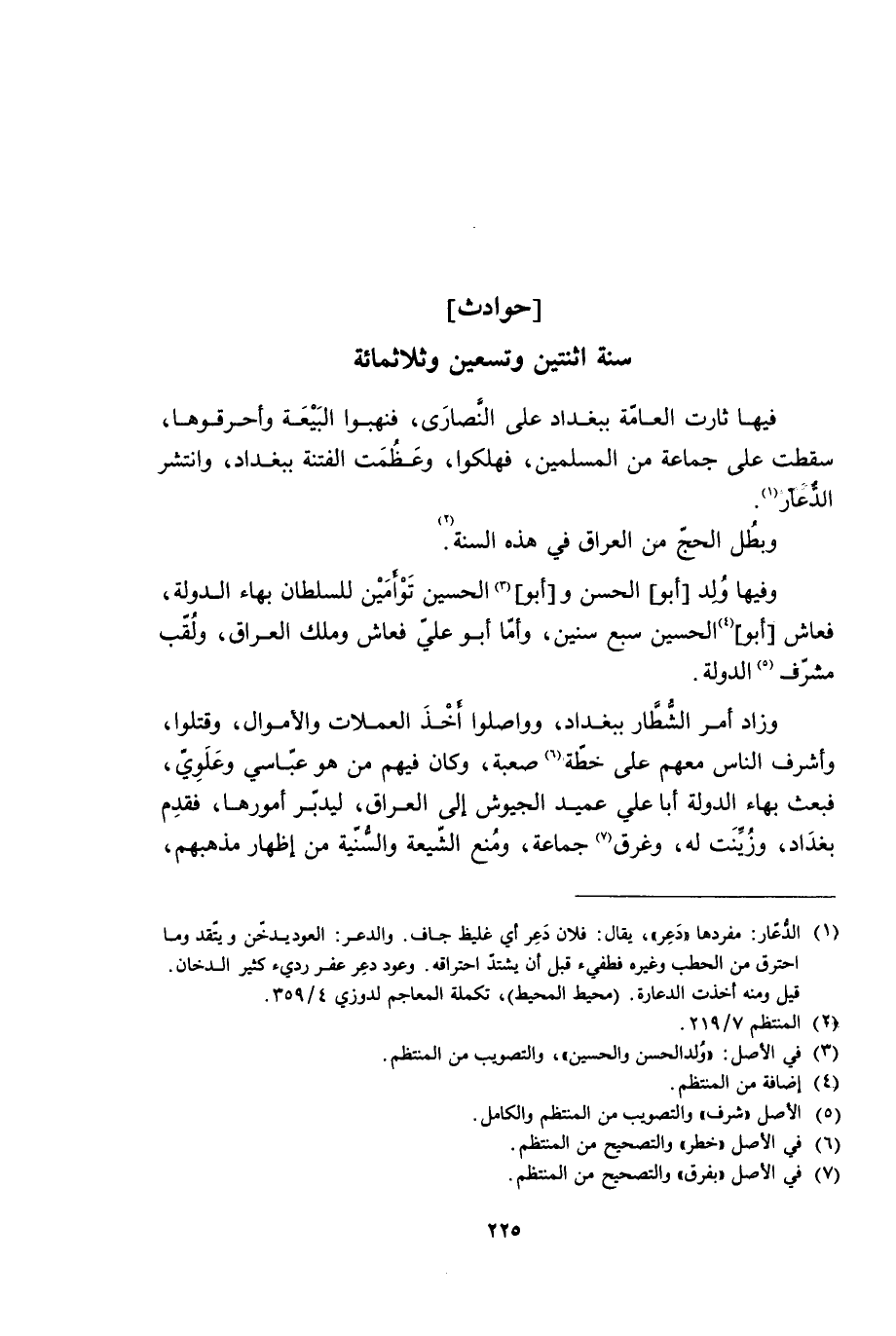 وزاد أمر الشُّطَّار ببغداد، وواصلوا أخذ العملات والأموال، وقتلوا، وأشرف النّاس معهم عَلَى خطّه [6] صعبة، وكان فيهم من هُوَ عباسي وعَلَوِيّ، فبعث بهاء الدولة أبا عَلِيّ عميد الجيوش إلى العراق، ليدبّر أمورها، فقدم بغداد، وزيِّنَت لَهُ، وغرق [7] جماعة، ومُنع الشّيعة والسُّنّية من إظهار مذهبهم،