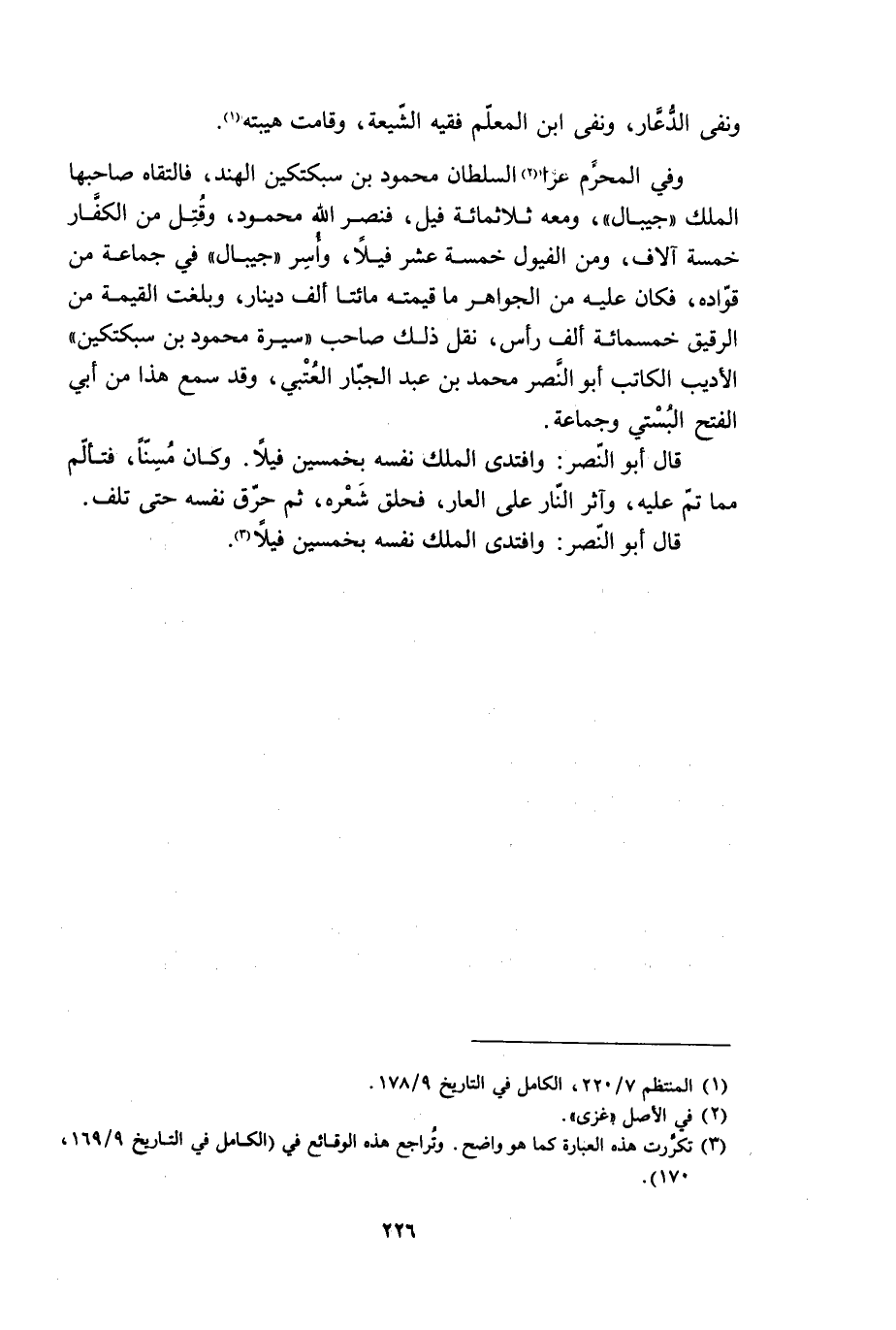 وفي المحرّم عزا [2] السلطان محمود بْن سبكتكين الهند، فالتقاه صاحبها الملك «جيبال» ، ومعه ثلاثمائة فيل، فنصر اللَّه محمود، وقتل من الكفار خمسة آلاف، ومن الفيول خمسة عشر فيلا، وأُسِر «جيبال» فِي جماعة من قوّاده، فكان عَلَيْهِ من الجواهر ما قيمته مائتا ألف دينار، وبلغت القيمة من الرقيق خمسمائة ألف رأس، نقل ذَلِكَ صاحب «سيرة محمود بن سبكتكين» الْأديب الكاتب أَبُو النَّصر مُحَمَّد بْن عَبْد الجبّار العُتْبي، وقد سَمِعَ هذا من أَبِي الفتح البُسْتِي وجماعة.
