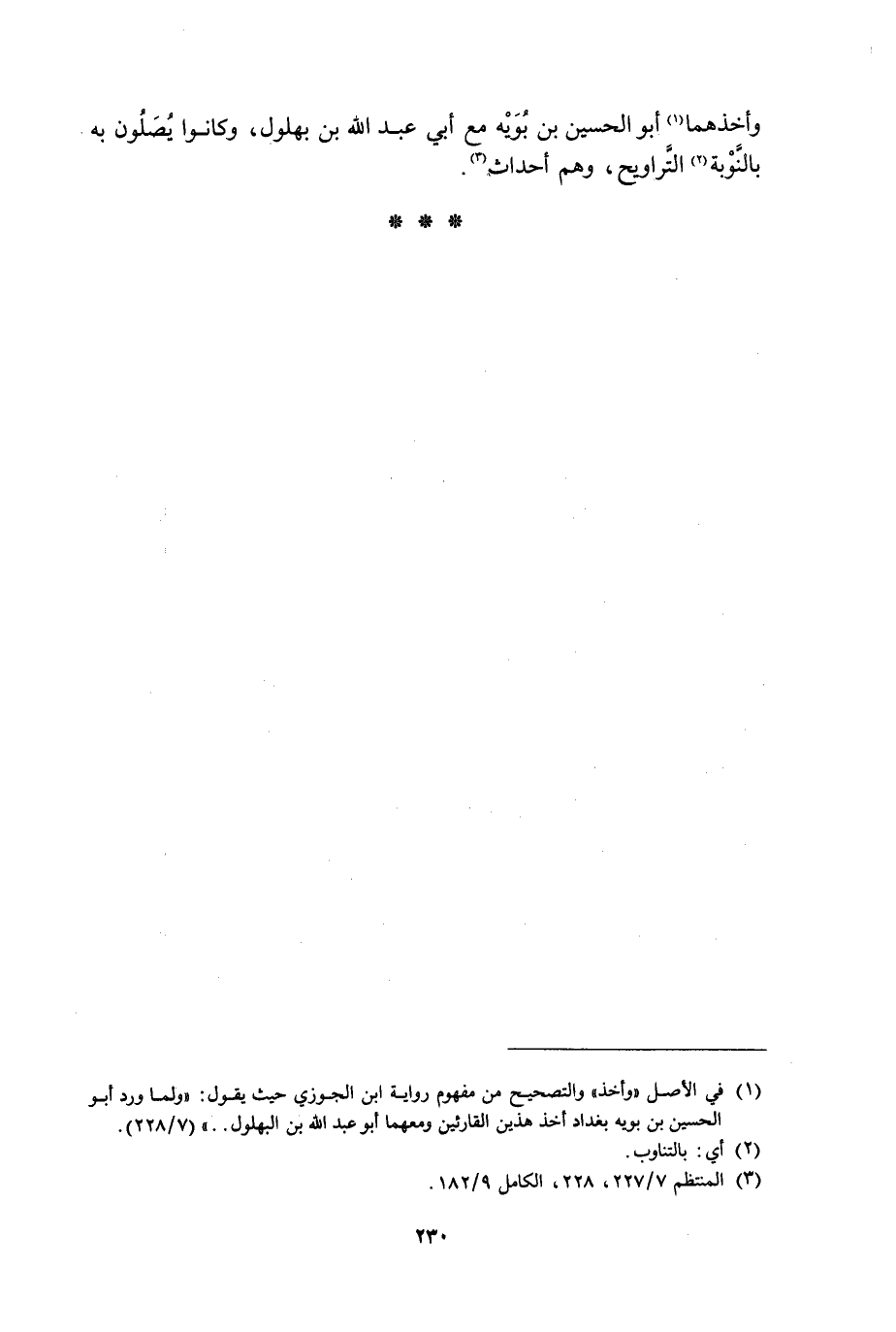 [1] في الأصل «وأخذ» والتصحيح من مفهوم رواية ابن الجوزي حيث يقول: «ولما ورد أبو الحسين بن بويه بغداد أخذ هذين القارئين ومعهما أبو عبد الله بن البهلول.» (7/ 228) .