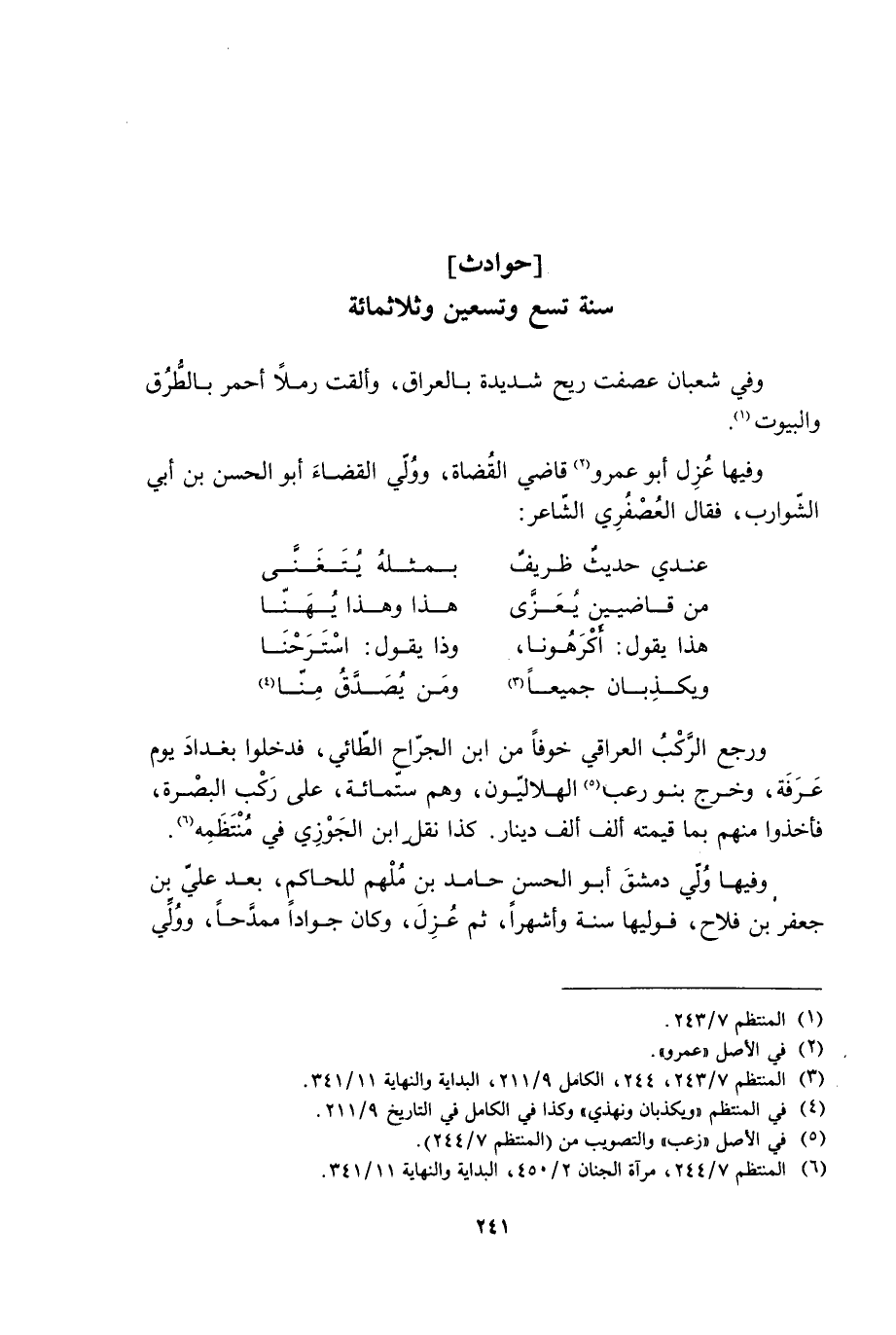[3] المنتظم 7/ 243، 244، الكامل 9/ 211، البداية والنهاية 11/ 341.