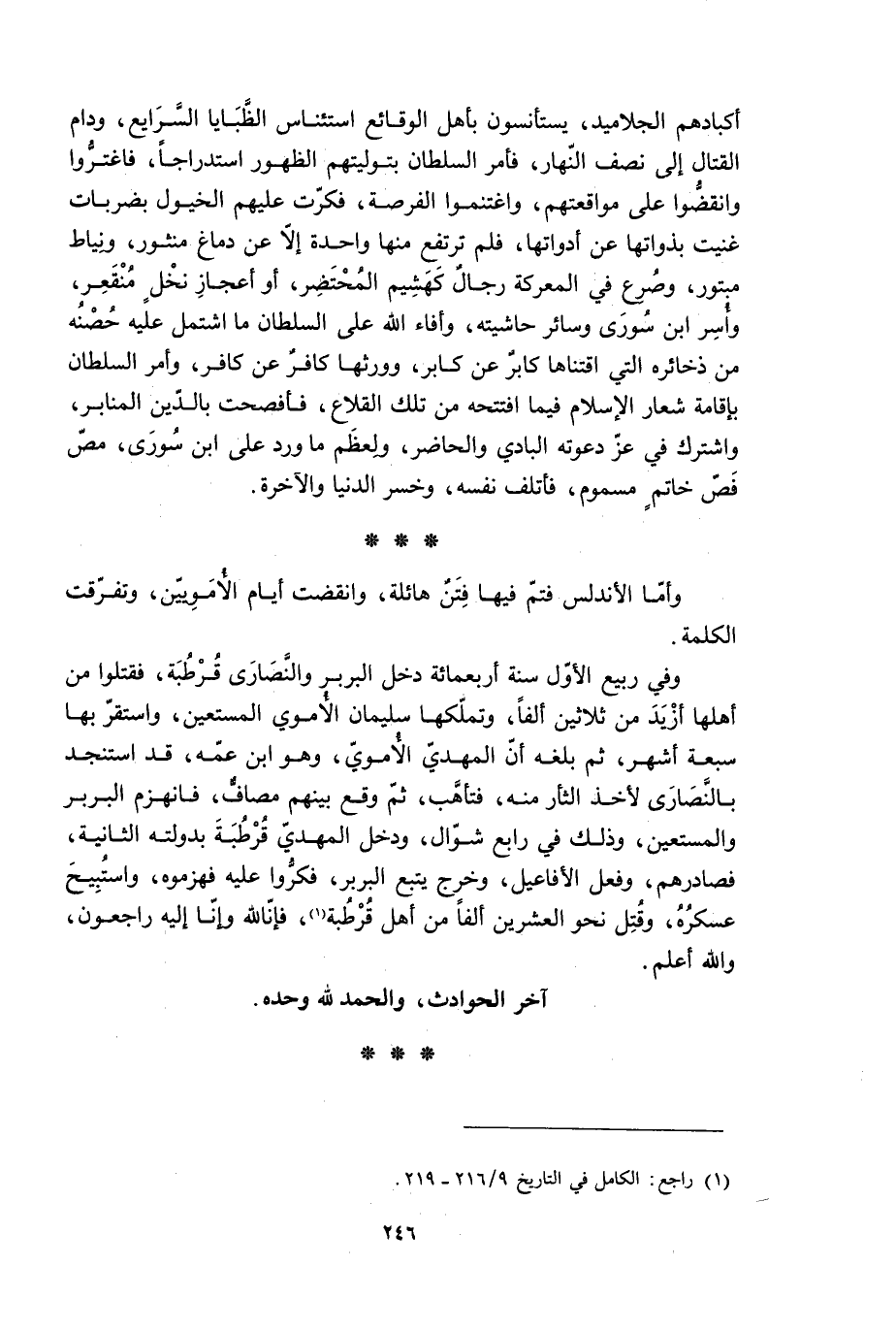 وأما الْأندلس فتمّ فيها فِتَنٌ هائلة، وانقضت أيام الْأمَوِيّين، وتفرقت الكلمة.