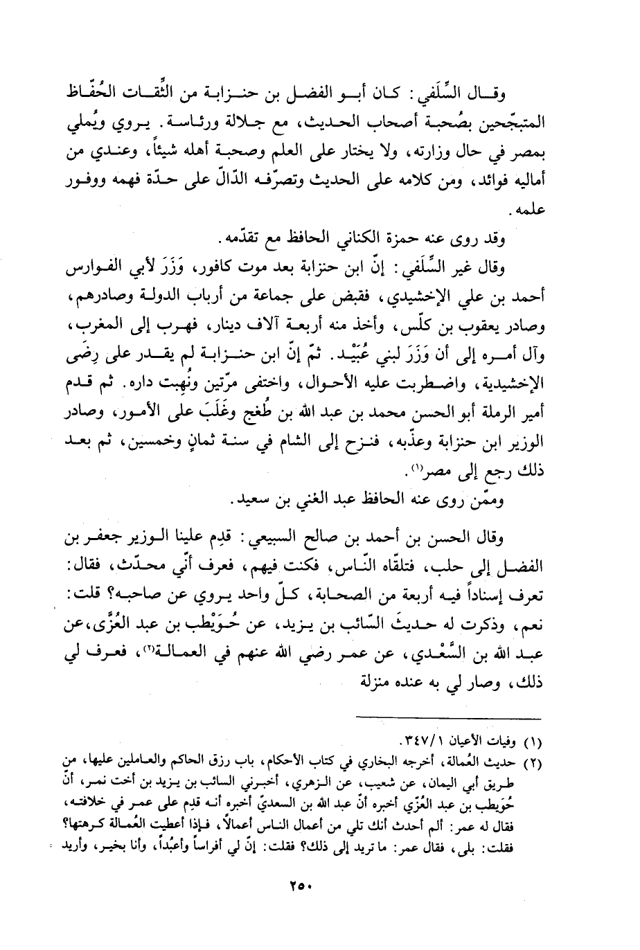 وقَالَ السلفي: كَانَ أَبُو الفضل بْن حنزابة من الثِّقات الحُفَّاظ المتبجّحين بصُحبة أصحاب الحديث، مَعَ جلالة ورئاسة. يرْوِي ويُملي بمصر فِي حال وزارته، ولا يختار عَلَى العلم وصحبة أهله شيئًا، وعندي من أماليه فوائد، ومن كلامه عَلَى الحديث وتصرّفه الدّالّ عَلَى حدّة فهمه ووفور علمه.
