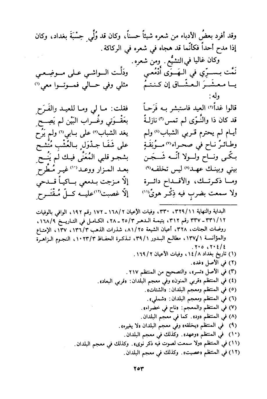 [ () ] البداية والنهاية 11/ 329، 330، وفيات الأعيان 2/ 168- 172 رقم 192، الوافي بالوفيات 12/ 331- 337 رقم 312، يتيمة الدهر 3/ 25- 28، الكامل في التاريخ 9/ 168، روضات الجنات، 328، أعيان الشيعة 25/ 81، شذرات الذهب 3/ 136، 137، الإمتاع والمؤانسة 1/ 137، مطالع البدور 1/ 39، تذكرة الحفاظ 3/ 1023، النجوم الزاهرة 4/ 204، 205.