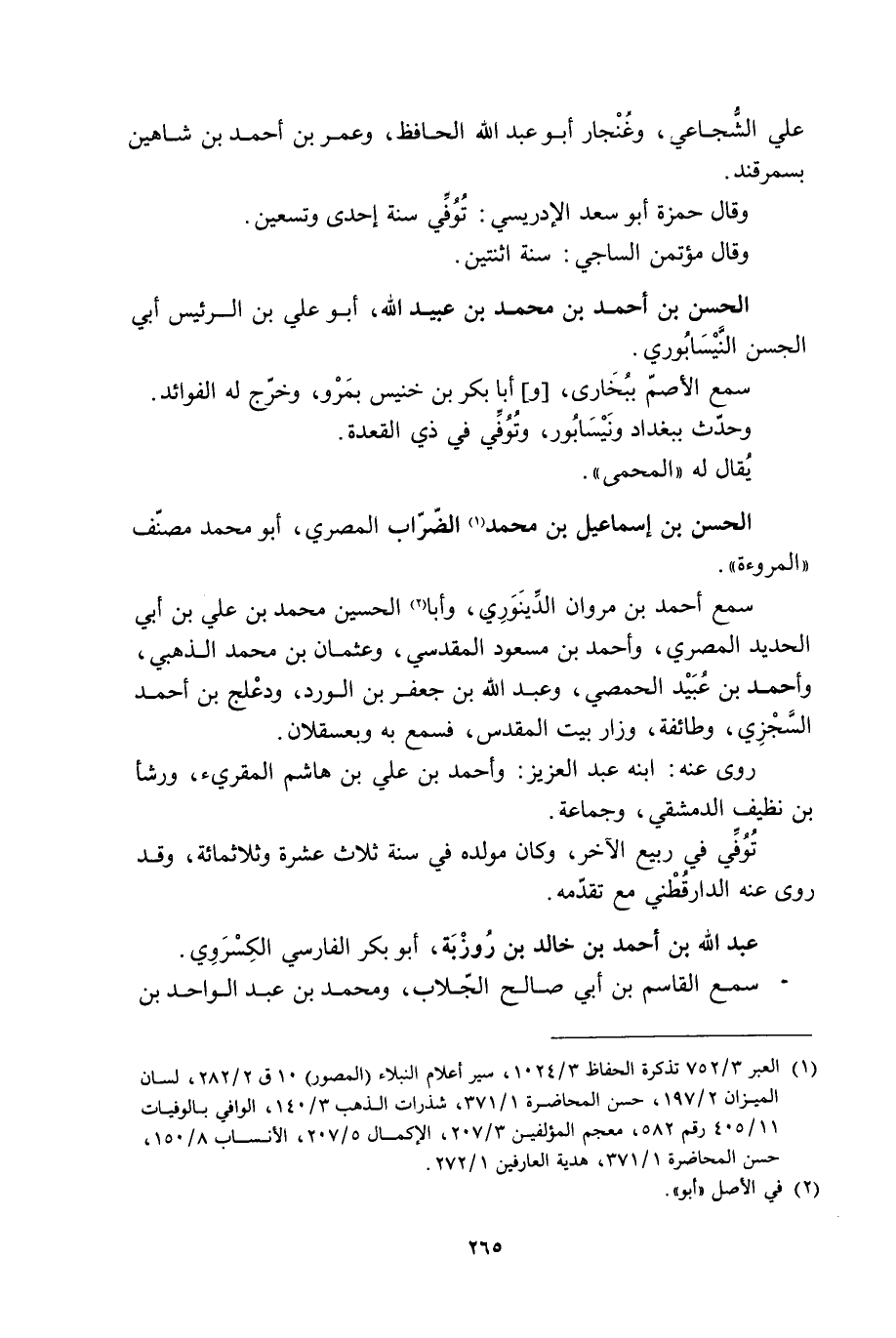 [1] العبر 3/ 752 تذكرة الحفاظ 3/ 1024، سير أعلام النبلاء (المصور) 10 ق 2/ 282، لسان الميزان 2/ 197، حسن المحاضرة 1/ 371، شذرات الذهب 3/ 140، الوافي بالوفيات 11/ 405 رقم 582، معجم المؤلفين 3/ 207، الإكمال 5/ 207، الأنساب 8/ 150، حسن المحاضرة 1/ 371، هدية العارفين 1/ 272.