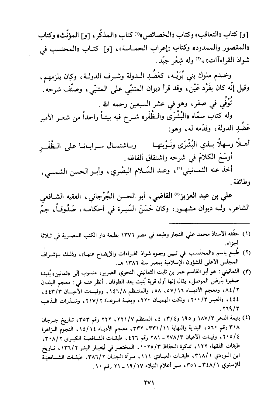 [و] كتاب «التعاقب» وكتاب «الخصائص» [1] كتاب «المذكّر، [و] المؤنّث» وكتاب «المقصور والممدود» وكتاب «إعراب الحماسة» ، [و] كتاب «المحتسب فِي شواذ القراءات» ، [2] وله شِعْر جيّد.