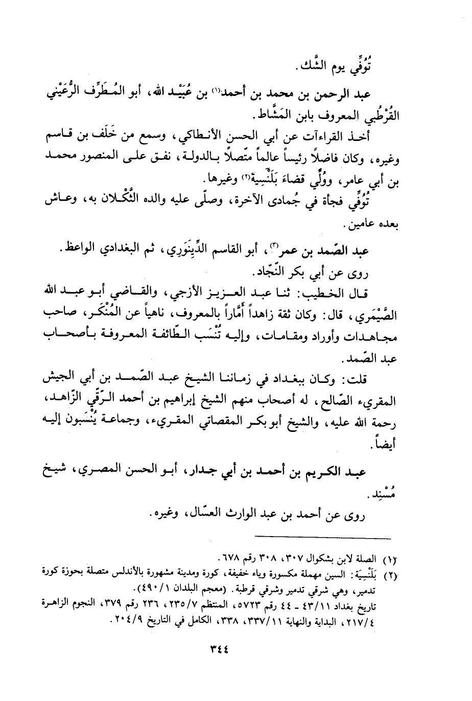 [3] تاريخ بغداد 11/ 43- 44 رقم 5723، المنتظم 7/ 235، 236 رقم 379، النجوم الزاهرة 4/ 217، البداية والنهاية 11/ 337، 338، الكامل في التاريخ 9/ 204.