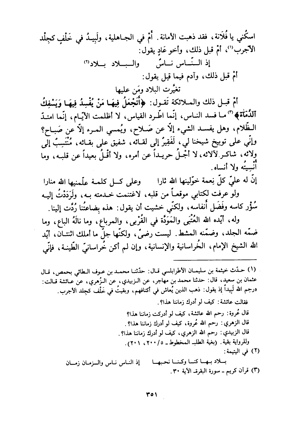 تغيّرت البلاد ومَن عليها أمْ قبل ذَلِكَ والملائكة تَقُولُ: أَتَجْعَلُ فِيها مَنْ يُفْسِدُ فِيها وَيَسْفِكُ الدِّماءَ 2: 30 [3] ما فسد الناس، وإنّما اطّرد القياس، لا أظلمت الأيّام،: إنّما امتدّ الظلام، وهل يفسد الشيء إلا عَنْ صَلاح، ويُمسي المرء إلا عَنْ صباح؟