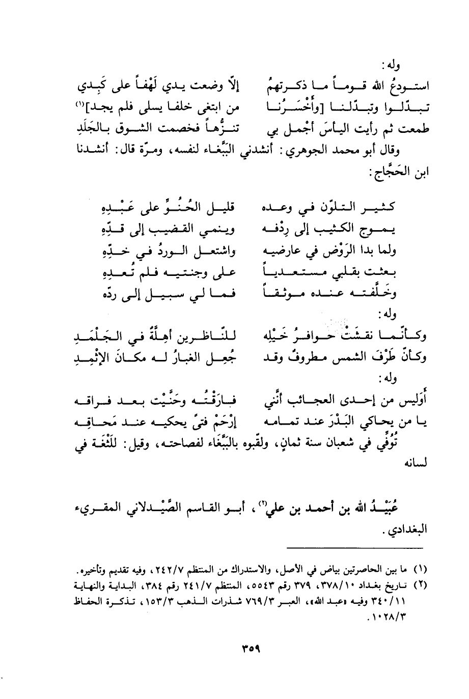 [2] تاريخ بغداد 10/ 378، 379 رقم 5543، المنتظم 7/ 241 رقم 384، البداية والنهاية 11/ 340 وفيه «عبد الله» ، العبر 3/ 769 شذرات الذهب 3/ 153، تذكرة الحفاظ 3/ 1028.