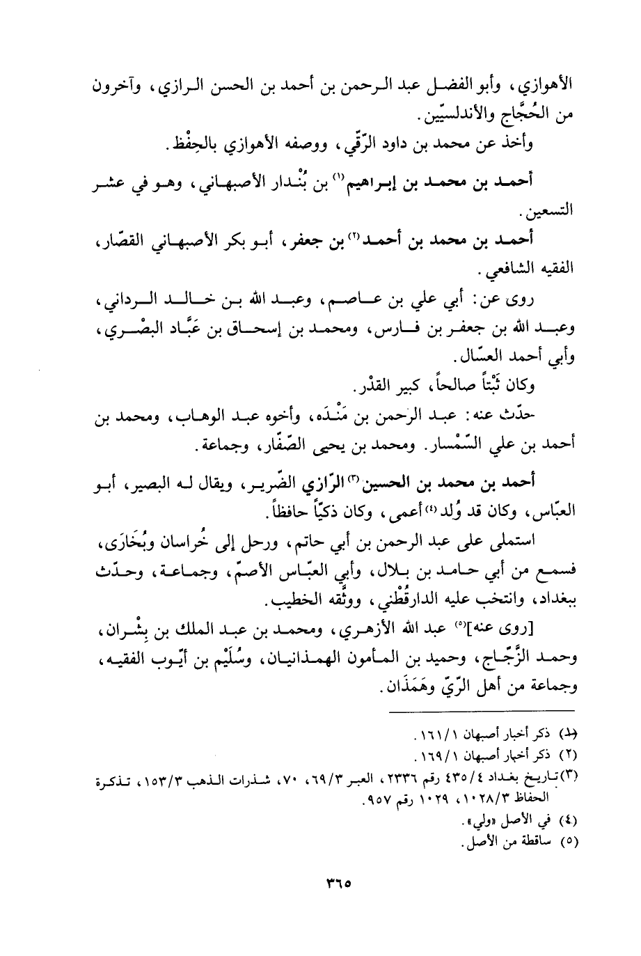 [3] تاريخ بغداد 4/ 435 رقم 2336، العبر 3/ 69، 70، شذرات الذهب 3/ 153، تذكرة الحافظ 3/ 1028، 1029 رقم 957.